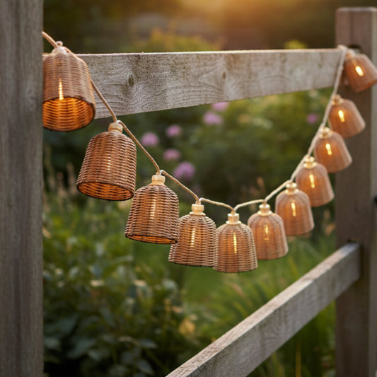 Guirlande lumineuse extérieur raccordable 10 abat-jour naturels en bambou LINA LIGHT HYBRID LED blanc chaud 8m solaire et sur secteur