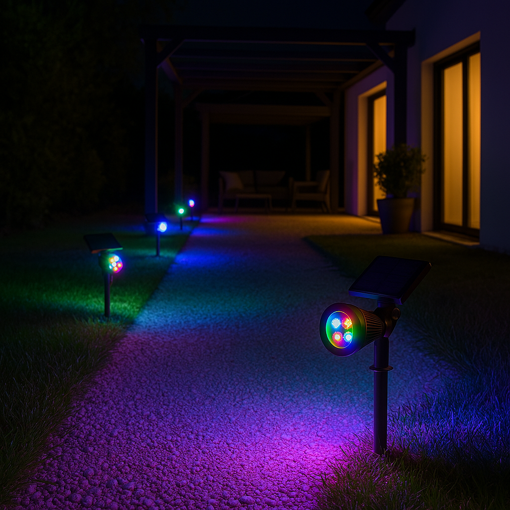 Set aus 2 solarbetriebenen 2-in-1-Strahlern zum Einstecken oder Befestigen, dimmbare mehrfarbige LED SPIKY C34 H42cm