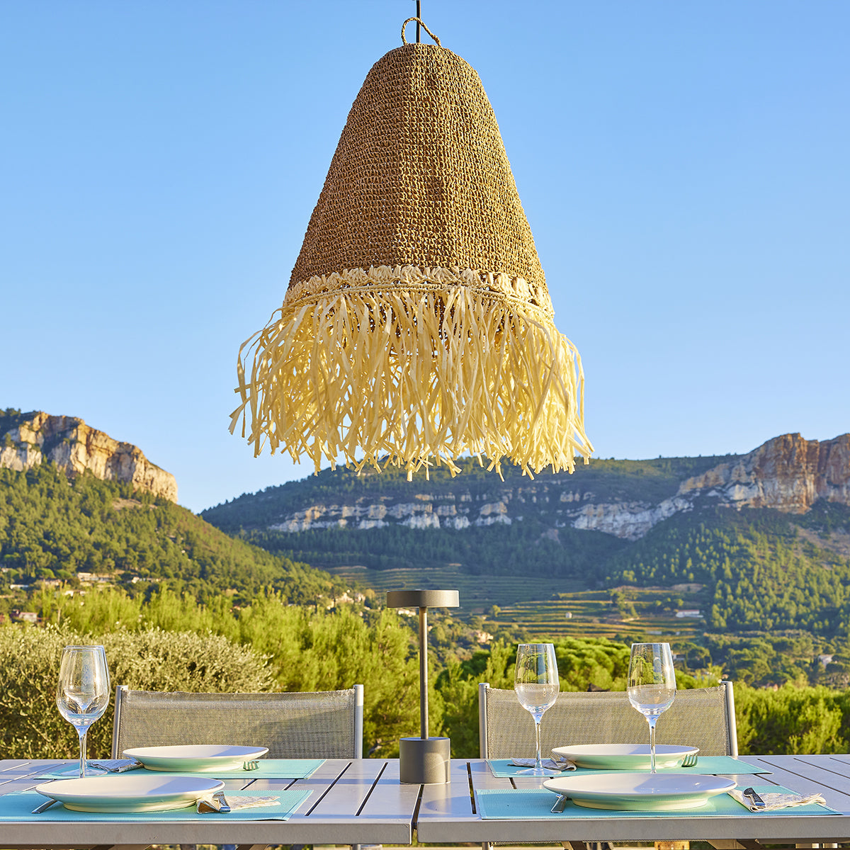 ABAT-JOUR EN HERBE MARINE : La suspension PALOMA OUTDOOR CABLE, issue de l'artisanat, est fabriquée en herbe marine et en fibre de papier. Ce sont des matériaux résistants, ils sont à la fois souple et rigide, ce qui permet une multitude de formes. Exotique et chaleureuse, elle mettra en lumière un intérieur moderne et va s'adapter parfaitement à un style plus bohème ou vintage grâce à son look ethnique chic. Son tressage unique va sublimer votre espace de vie. Dimensions : Diamètre 40 x 45 cm de Hauteur.