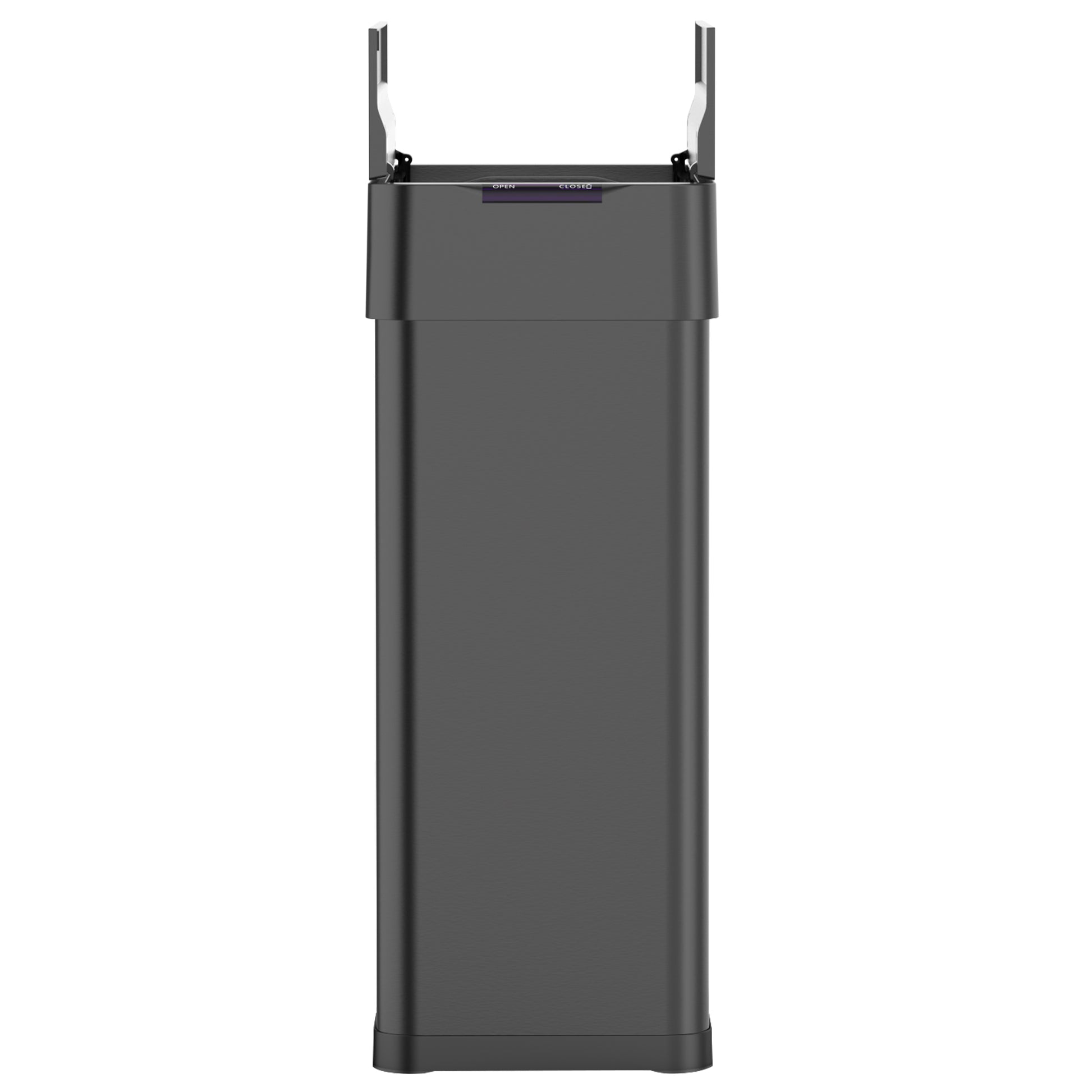La poubelle automatique SILVERLAKE 70L noir mat de Kitchen Move combine élégance contemporaine et praticité. Son système d’ouverture papillon automatique offre un large accès tout en limitant l’encombrement, idéal sous un plan de travail. Le corps en acier inoxydable noir mat et le couvercle en ABS assorti s’intègrent parfaitement dans une cuisine moderne ou un bureau design. Grâce à son capteur infrarouge, le couvercle s’ouvre sans contact à environ 15 cm, pour une hygiène parfaite. Elle fonctionne avec 4 piles AA (non incluses) ou via port DC USB (câble fourni). Dotée d’un cerclage intérieur pour maintenir le sac en place, d’une base antidérapante et d’une fermeture silencieuse, elle allie style et confort au quotidien. Sa surface anti-traces et son entretien facile garantissent une utilisation longue et agréable. Dimensions : 42,4 × 26,9 × 67 cm.