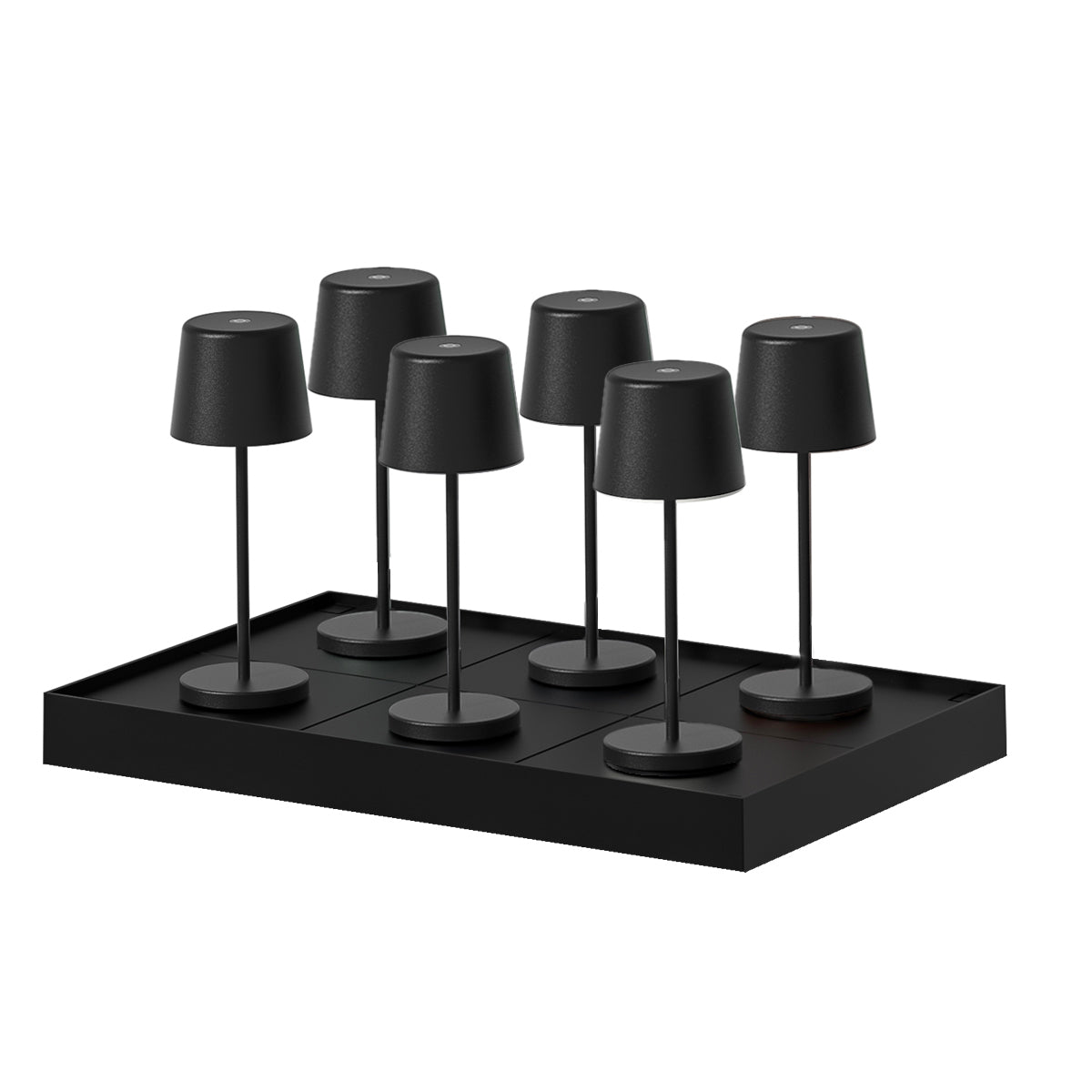 Lot de 6 mini lampes de table touch sans fil en aluminium LED KELLY MINI BLACK blanc dimmable H22cm avec plateau de chargement