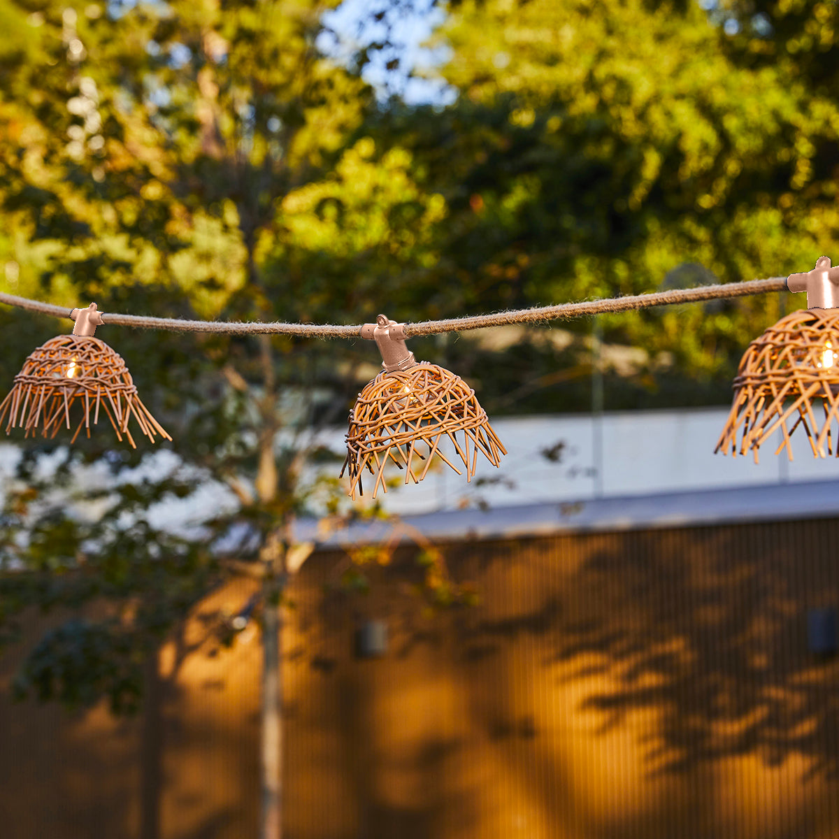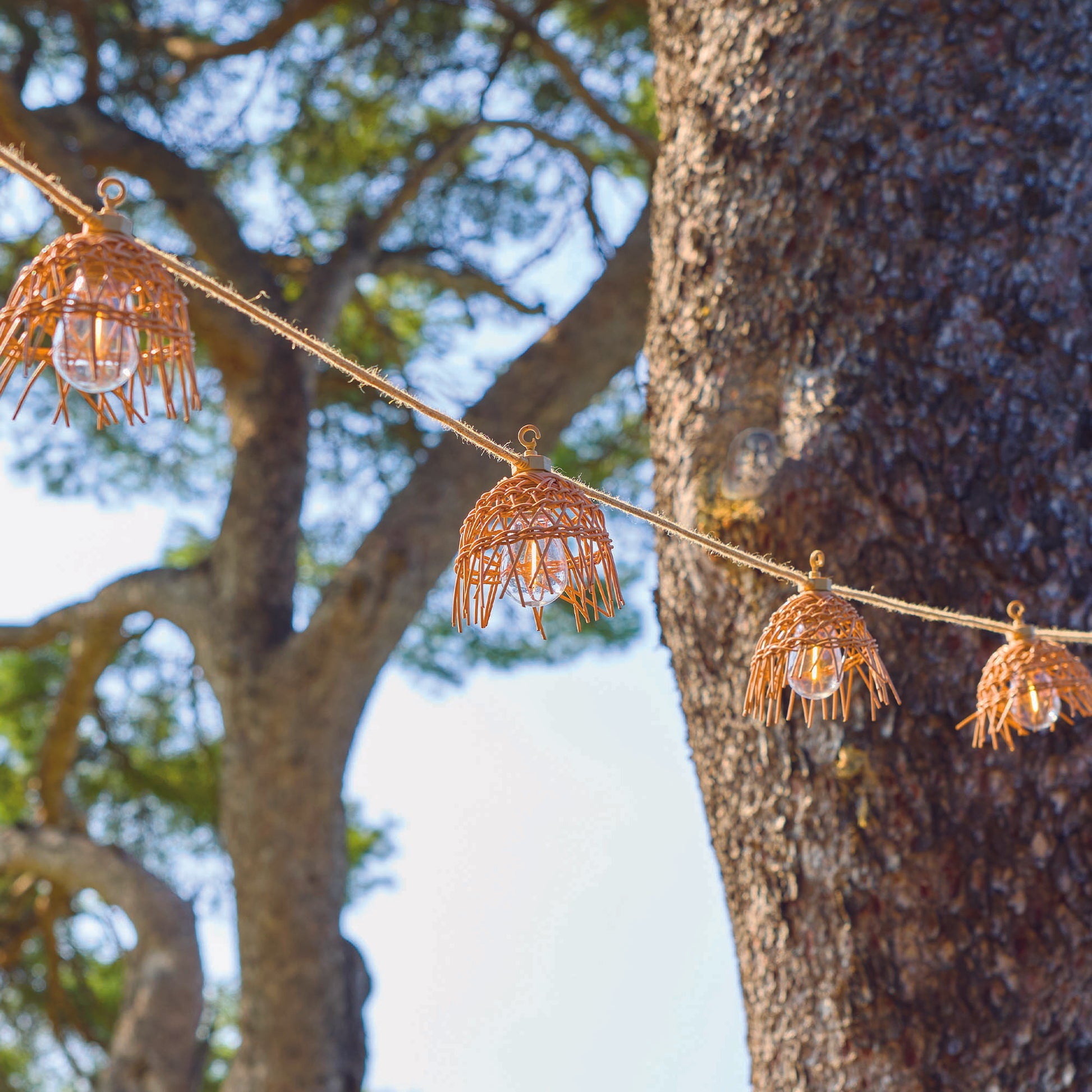 Guirlande lumineuse extérieur 10 abat-jour exotique paille MINI HAWAI LIGHT HYBRID LED blanc chaud 8m solaire et sur secteur
