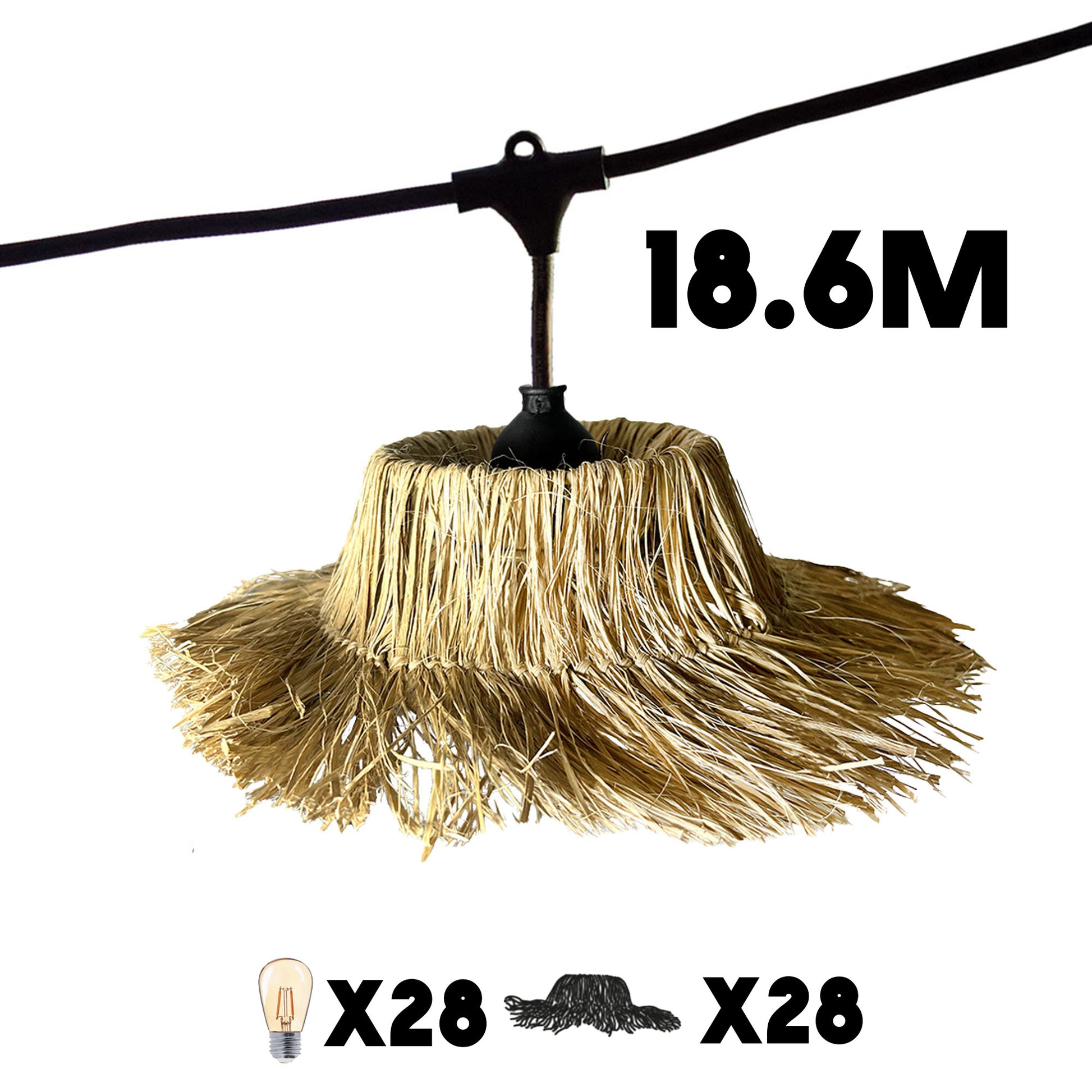 Guirlande lumineuse extérieure raccordable 18.6m avec 28 ampoules LED filament E27 blanc chaud TAHITI LIGHT Abat-jour en paille bohème