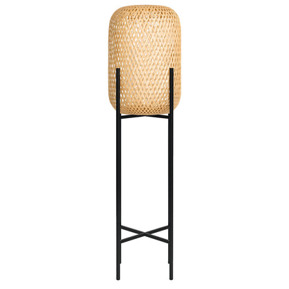- Lampadaire LED sans fil design : abat-jour tressé effet bois en polyrotin et structure en métal noir. Équipé de l’ampoule rechargeable LYS à fixation magnétique, il diffuse une lumière blanche ou multicolore pour un rendu moderne et élégant.
