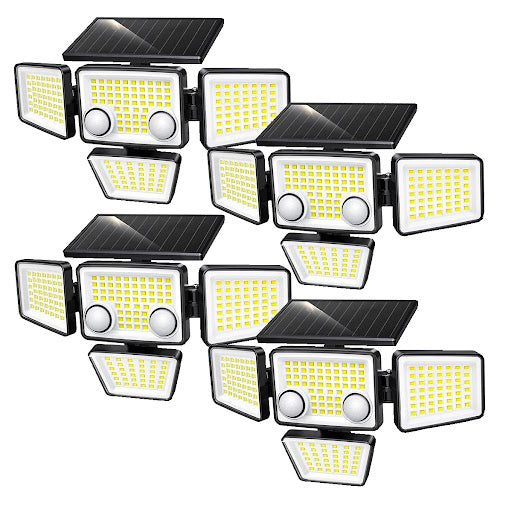 - Éclairage puissant et large couverture : Lot de 4 projecteurs solaires FAIRVIEW à 4 têtes orientables (horizontal/vertical), équipés de 188 LEDs ultra-lumineuses. Avec 700 lumens et un angle d’éclairage de 270°, ils illuminent efficacement vos jardins, allées, garages et zones sombres, bien plus larges que les spots classiques à 90°.