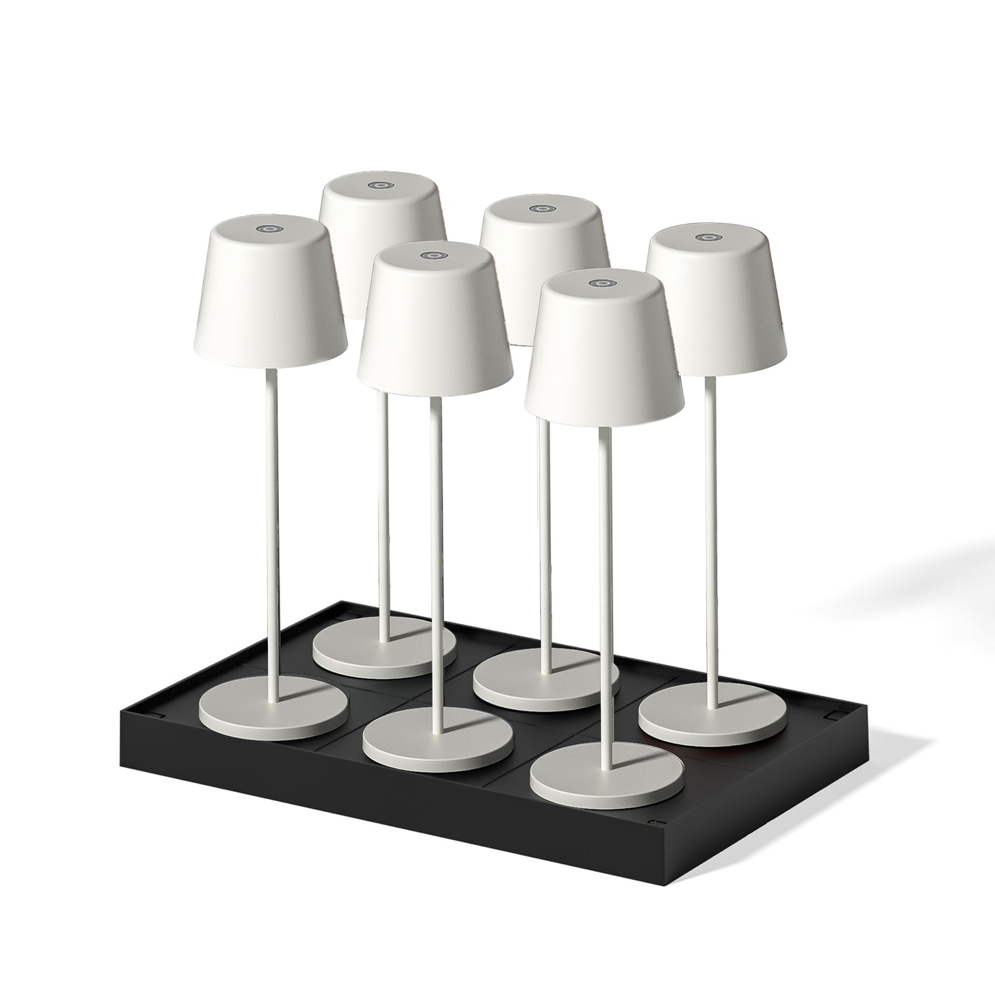 LOT DE 6 LAMPES DE TABLE LED : Découvrez notre lot de 6 lampes de table LED sans fil, conçues avec une base LED blanc chaud à intensité variable. Ces lampes à poser se distinguent par leur design sobre et élégant, tout en offrant une grande autonomie de fonctionnement allant jusqu’à 7 heures. Parfaites pour ajouter une touche chic et tendance à votre décoration, elles sont idéales comme lampes de table design, lampes de chevet ou pour illuminer vos tables lors d’événements festifs. Avec le plateau de chargement inclus, rechargez facilement toutes vos lampes en un seul geste.