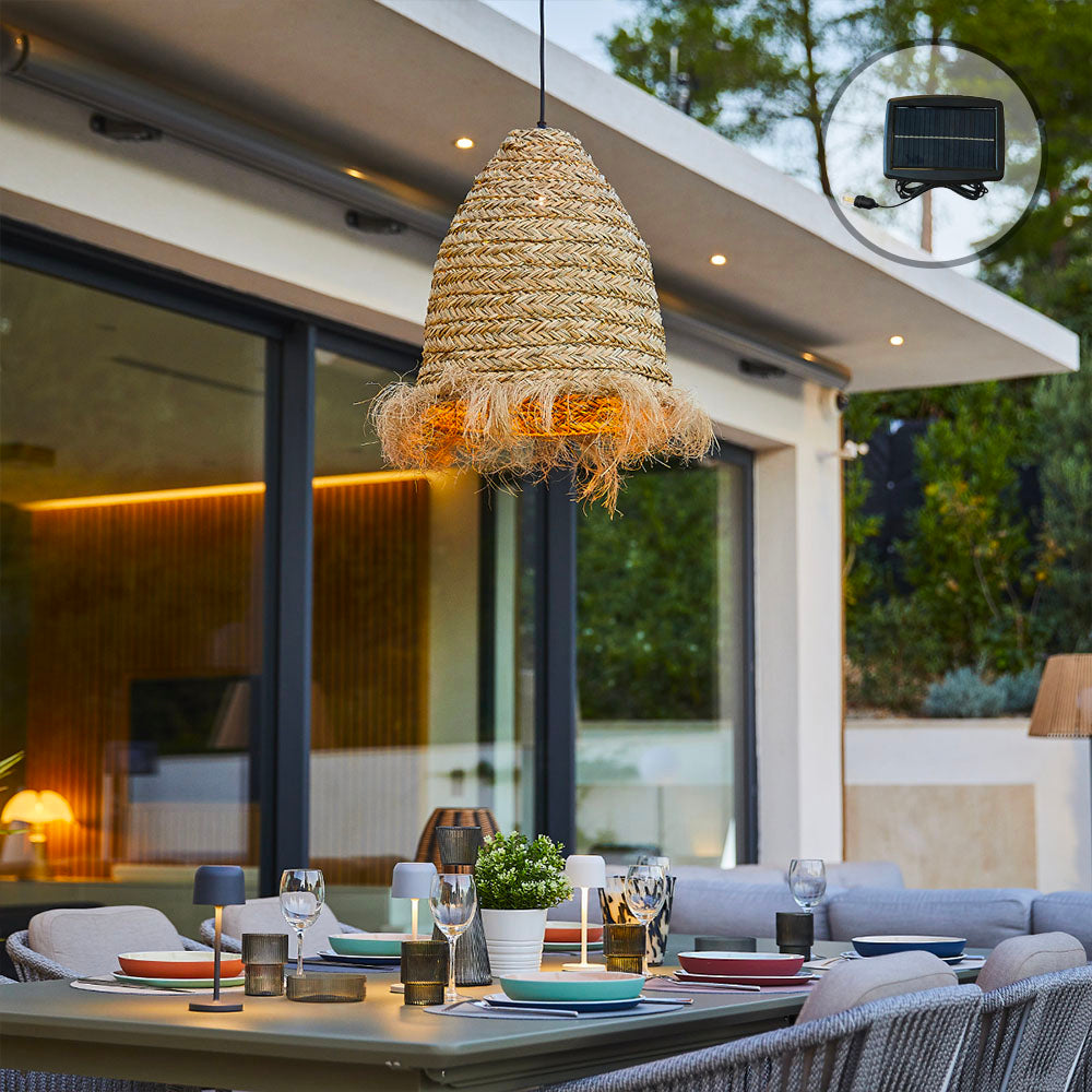 La suspension solaire ANAFI SOLAR 5m de longueur (Dimensions : ø41 x H47 cm), est une création artisanale en jonc de mer. Elle diffuse une lumière LED blanc chaud et apporte une touche exotique et chaleureuse à votre décoration. Son tressage unique et son style ethnique chic s'intègrent à merveille dans les ambiances modernes, bohèmes ou vintage. La ANAFI SOLAR est fournie avec son câble d'extérieur hybride ENNA SOLAR, doté d'une ampoule LED intégrée et remplaçable. Ce système vous offre la liberté de choix : Par recharge solaire ou secteur 220-240V. L'ampoule offre une puissance lumineuse de 600 lumens et une lumière blanc chaud. De plus, elle est dimmable et propose 4 niveaux d'intensité pour s'adapter parfaitement à l'ambiance souhaitée. Profitez de vos soirées en toute tranquillité. La suspension ANAFI SOLAR bénéficie d'une autonomie exceptionnelle de près de 8 heures une fois chargée au maximum (que ce soit par énergie solaire ou via secteur). Le temps de charge complet est de 6 à 8 heures via solaire. Un voyant de niveau de batterie intégré vous permet de vérifier facilement l'énergie restante. Grâce à sa conception sans fil et son système de recharge hybride, la SEVIA SOLAR est idéale partout : sur votre terrasse, votre balcon, ou dans votre salon. Le jonc de mer est un matériau résistant et durable. Conseil d'entretien : Pour préserver l'abat-jour, il est recommandé de le suspendre à l'abri de l'humidité et de la pluie.