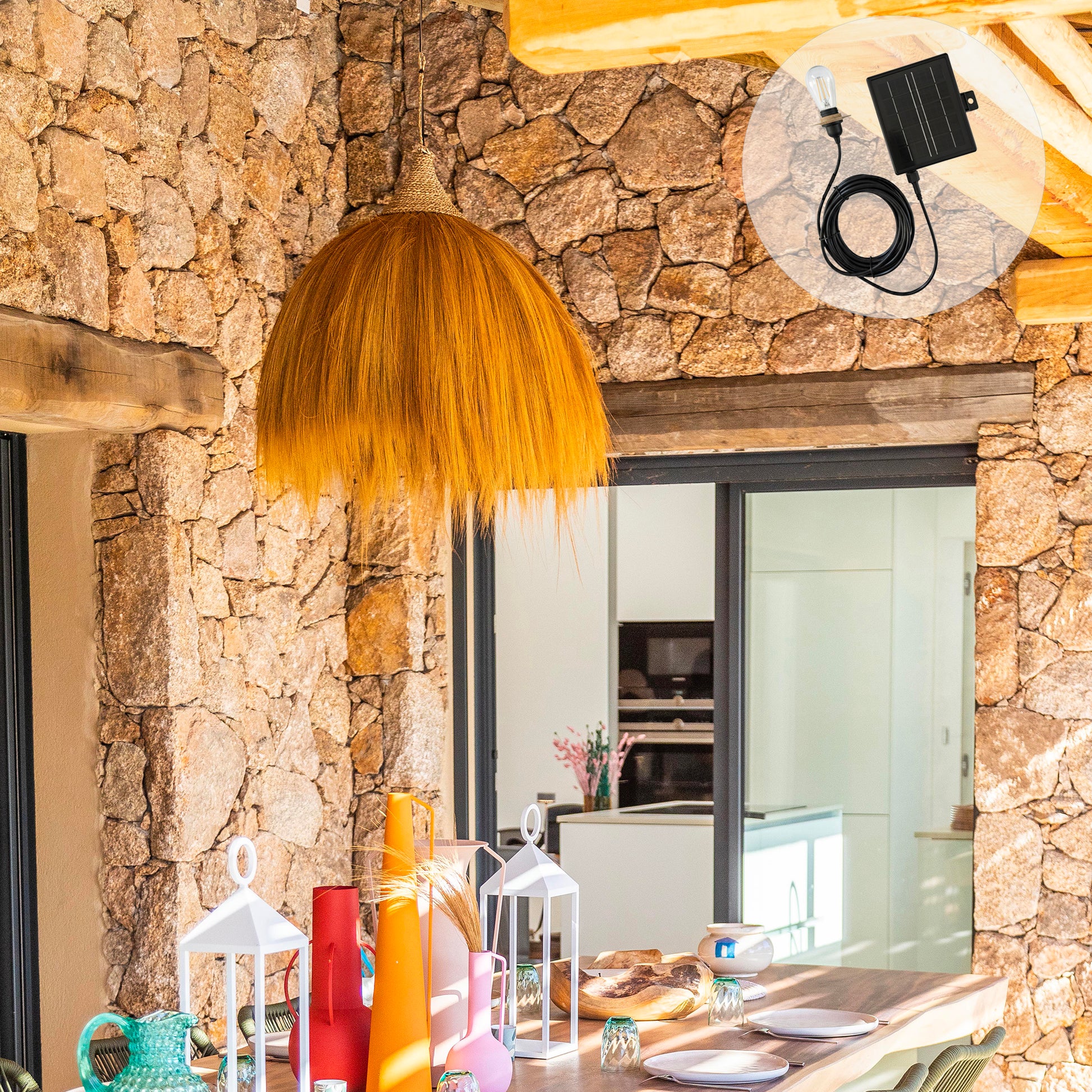 La suspension solaire Masai Solar est une création artisanale en herbe de rayung naturelle offrant un trèssage soigné de 60 cm de diamètre pour 40 cm de hauteur. Elle est fournie avec le câble hybride Enna Solar et son ampoule LED remplaçable de 600 lumens blanc chaud. Ce système hybride offre une liberté totale avec une recharge solaire de 6 à 8 heures ou sur secteur de 220-240V, assurant une autonomie de 8 heures. Dimmable sur 4 niveaux d'intensité, elle s'adapte à toutes vos ambiances extérieures avec un style ethnique chic chaleureux chaque soir de l'année. L'herbe de rayung est une fibre résistante et durable, idéale pour structurer vos terrasses durablement. Un voyant intégré permet de vérifier l'énergie restante en un geste simple. Son câble souple facilite le positionnement autour d’une rambarde, d’un parasol ou le long d’un mur, et l’éclairage reste agréable sans éblouir.